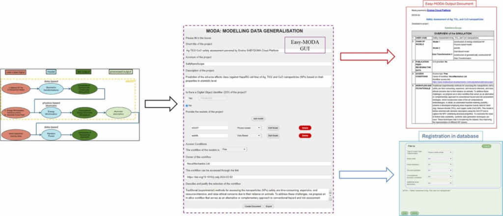 The tool supports the Safe and Sustainable by Design (SSbD) framework by enabling the reuse and adaptation of previously documented modelling workflows. Scientists can retrieve detailed workflows from the Easy-MODA database, replicate or tailor them for their specific case studies, and avoid duplicating effort. By encouraging the registration and sharing of new workflows, Easy-MODA promotes transparency, knowledge transfer, and the faster deployment of safe and sustainable solutions in line with the goals of the INSIGHT project.